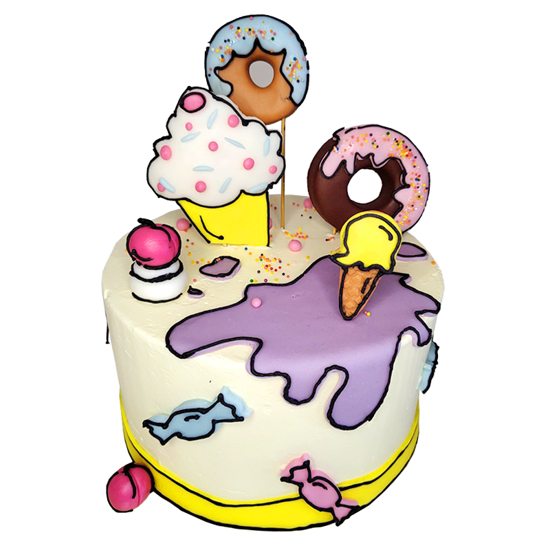 Съставки: Пълнеж: СИРЕНЕ Маскарпоне (25%), млечна СМЕТАНА, блат (ЯЙЦА, ПШЕНИЧНО брашно тип 500, кристална захар, пудра захар, питейна вода, слънчогледово масло), горски плодове (12.5%)(боровинки, ягоди, малини, къпини, кристална захар, царевично нишесте), захарен сироп, пудра захар, желатин. Декорация в променливи пропорции: маслен крем (захарен фондан, краве МАСЛО 45,5%), захарно тесто (захар, глюкозен сироп, напълно хидрогенирано растително масло (палмово и памучно), вода, влагозадържащ агент: глицерол, модифицирано нишесте, сгъстители: (Е466), гума арабика, гума ксантан, консервант: калиев сорбат, ароматизант: ванилия, регулатор на киселинността: лимонена киселина), UHT продукт на растителна основа (вода, напълно хидрогенирана растителна мазнина (палмова) 25%, захар 12%, МЛЕЧЕН протеин, емулгатори: Е472b, СОЕВ лецитин, Е472е, стабилизатори: Е460, Е466, Е331, Е340, ароматизант: ванилия, оцветител: Е160а), естествени оцветители.